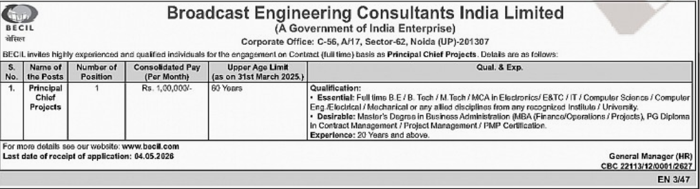 BECIL Principal Chief Projects Recruitment 2026 has been announced by Broadcast Engineering Consultants India Limited (A Government of India Enterprise). The recruitment is for experienced professionals on a contract (full-time) basis for the post of Principal Chief Projects.