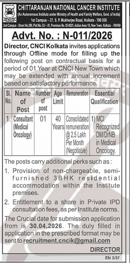 CNCI Kolkata Recruitment 2026 brings a great opportunity for medical professionals as Chittaranjan National Cancer Institute (CNCI), Kolkata invites offline applications for the post of Consultant (Medical Oncology) on a contractual basis.