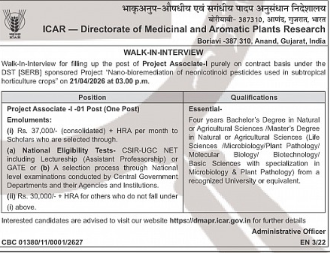 ICAR DMAPR Recruitment 2026 notification has been released for the post of Project Associate-I on a contractual basis under a DST (SERB) sponsored project. Eligible candidates can attend the walk-in interview on 21 April 2026 at 03:00 PM at ICAR–Directorate of Medicinal and Aromatic Plants Research (DMAPR), Anand, Gujarat.