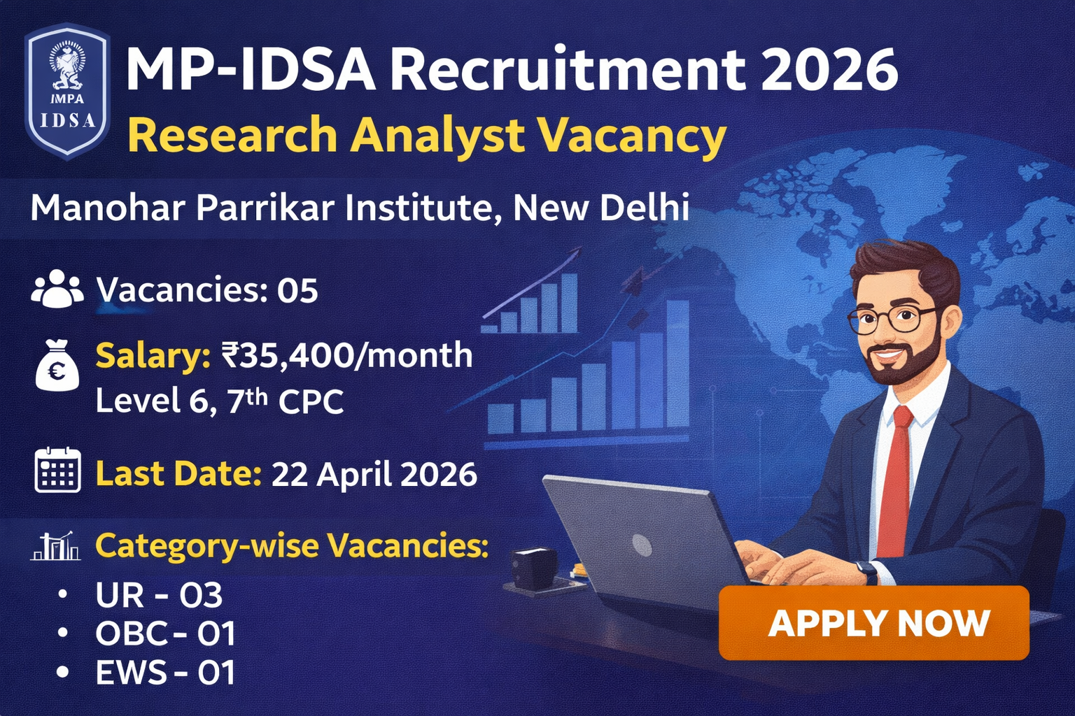 MP-IDSA Recruitment 2026 offers a prestigious opportunity for candidates interested in defence research and strategic studies. The recruitment is being conducted by the Manohar Parrikar Institute for Defence Studies and Analyses (MP-IDSA), a premier autonomous institution under the Ministry of Defence, Government of India. The position of Research Analyst is ideal for candidates with a strong academic background and interest in national security, international relations, and policy research.