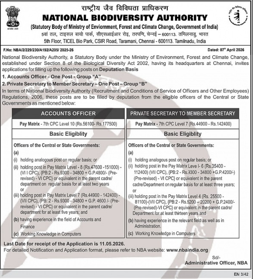 National Biodiversity Authority Recruitment 2026 invites applications from eligible officers for prestigious deputation-based positions under the National Biodiversity Authority, functioning under the Ministry of Environment, Forest and Climate Change. This is a great opportunity for government employees to work in a reputed statutory body focused on biodiversity conservation.