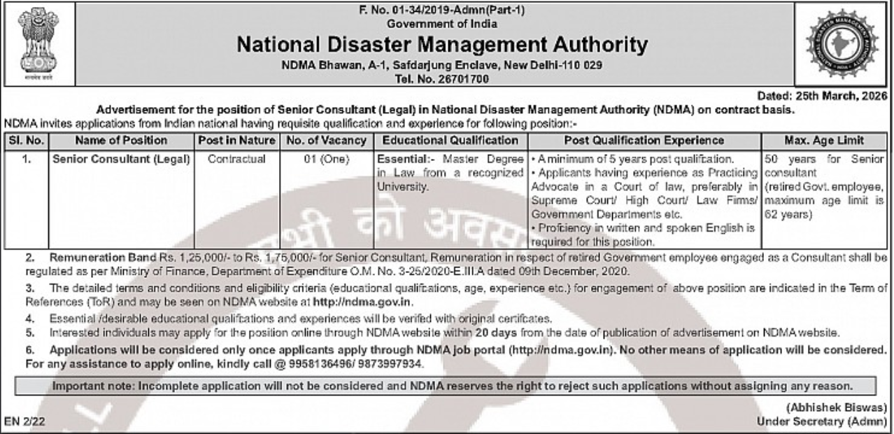 The National Disaster Management Authority (NDMA), Government of India, has released an official notification inviting applications for the post of Senior Consultant (Legal) on a contractual basis. This is a great opportunity for experienced legal professionals who have a strong background in litigation and advisory roles, especially those who have worked with courts or government departments.