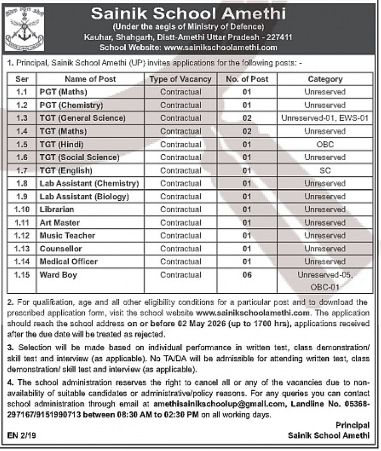 Sainik School Amethi has invited applications for multiple contractual teaching and non-teaching vacancies for the academic session 2026. The school, functioning under the Ministry of Defence, is looking for qualified candidates for PGT, TGT, and various support staff roles.