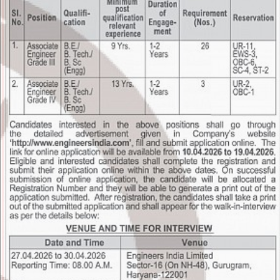 The Engineers India Limited Walk-in Interview 2026 is a great opportunity for experienced professionals in engineering fields. Engineers India Limited (EIL), a Navratna PSU and a leading engineering consultancy company, is inviting applications from skilled candidates for fixed-term positions in disciplines such as Mechanical, Electrical, and Instrumentation. This Engineers India Limited Walk-in Interview 2026 aims…