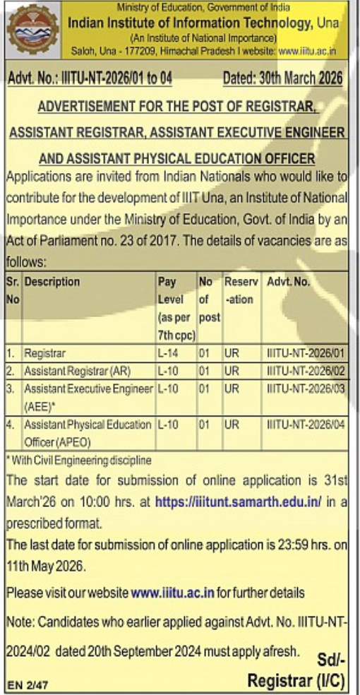 • Indian Institute of Information Technology Una Recruitment 2026 – Apply for Registrar, Assistant Registrar & Engineer PostsApril 15, 2026