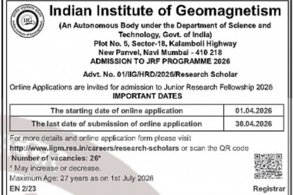 The Indian Institute of Geomagnetism (IIG), an autonomous body under the Department of Science and Technology, Government of India, invites online applications for admission to the Junior Research Fellowship (JRF) Programme 2026. This is a prestigious opportunity for candidates aspiring to build a career in geosciences and research. Important Dates: Application Start Date: 01 April…